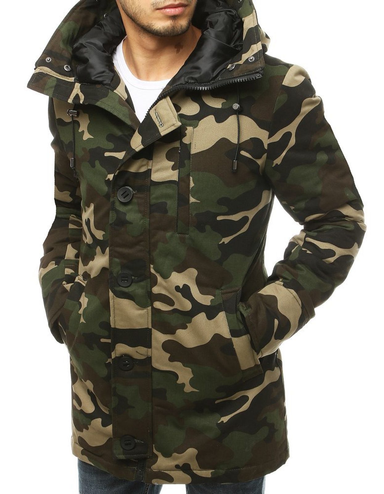 Kényelmes téli terepmintás-zöld parka kabát, mindennapi viseletre. Téli időszakra. Kihaljott gallérral, és kaucnival-mely lekapcsolható. Hosszab fazonú, több zsebbel ellátva. Három külső zsebbel, és egy belső zsebbel.ellátva. A derék bőség belső zsinórral szabályozható. Rejtett cipzár, kívül patengombokkal ellátva. Nagyon divatos, meleg téli kabát. Viselője nem fog fázni benne.