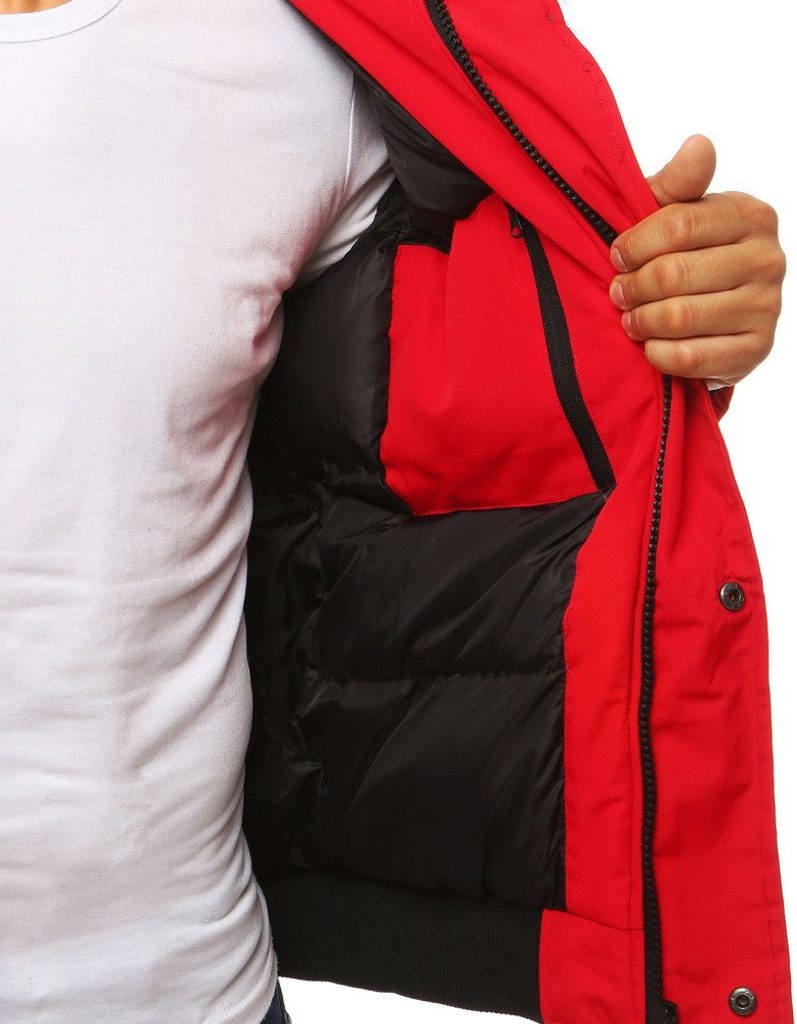 Rendkívül stílusos, modern téli bomber dzseki. Piros színben. Kiváló minőségű, puha, szép esésű anyagból készült. Enyhén testhezálló fazon, hosszú ujjakkal, kapucnival rendelkezik. Lekapcsolható szőrmés gallérral. Elöl cipzáras rögzítés, kétoldalt zsebfedős zsebek. Az összes szegély gumírozott passzével elvégzett. Derékig érő hossz.
