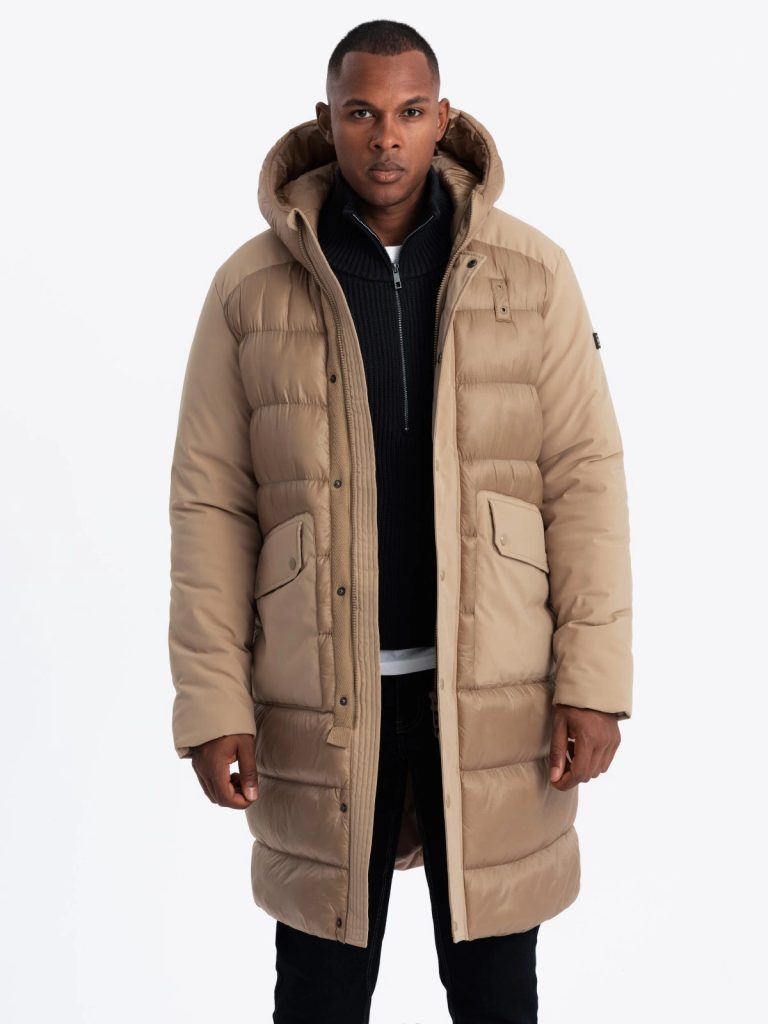 férfi hosszú téli kabát kapucnival magas gallér a külső anyag gyorsan száradó steppelt fényes, sima felső szövet cipzáras és patentos rögzítők két nagy patch zseb két elülső zseb két belső zseb tépőzárral bélelve anyaga: 100% nylon bélés anyaga: 100% poliészter