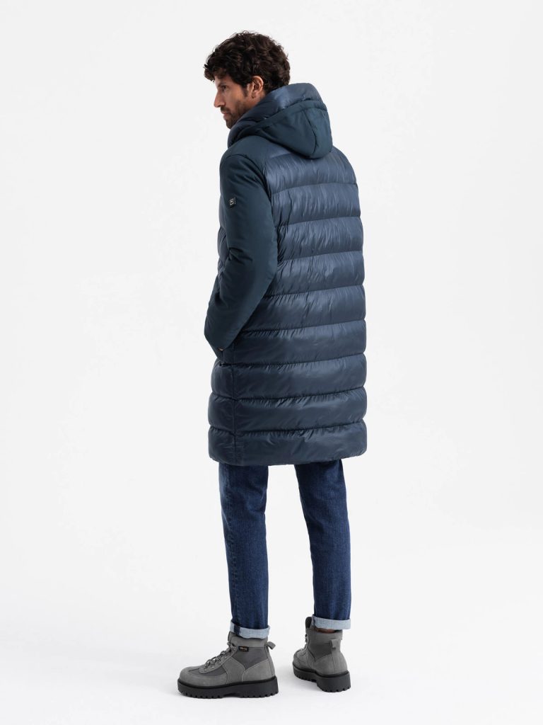 férfi hosszú téli kabát kapucnival magas gallér a külső anyag gyorsan száradó steppelt fényes, sima felső szövet cipzáras és patentos rögzítők két nagy patch zseb két elülső zseb két belső zseb tépőzárral bélelve anyaga: 100% nylon bélés anyaga: 100% poliészter