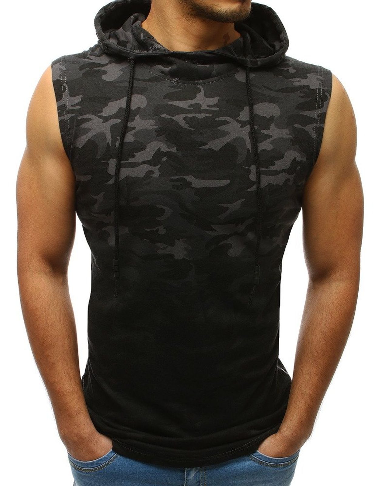 Antracit szürke terepmintás kapucnis atlétatrikó. Fehér felirat a kapucni mentén. Az oldalán cipzárral ellátva. Modern férfiak számára ajánlott, aki az aktív életformát vallja. A hátsó része, madzaggal rendelkezik, kivágással. Kapucnis atléta, zsinór behúzással. Elsősorban kellemes és tartós anyaga miatt kedvelt.