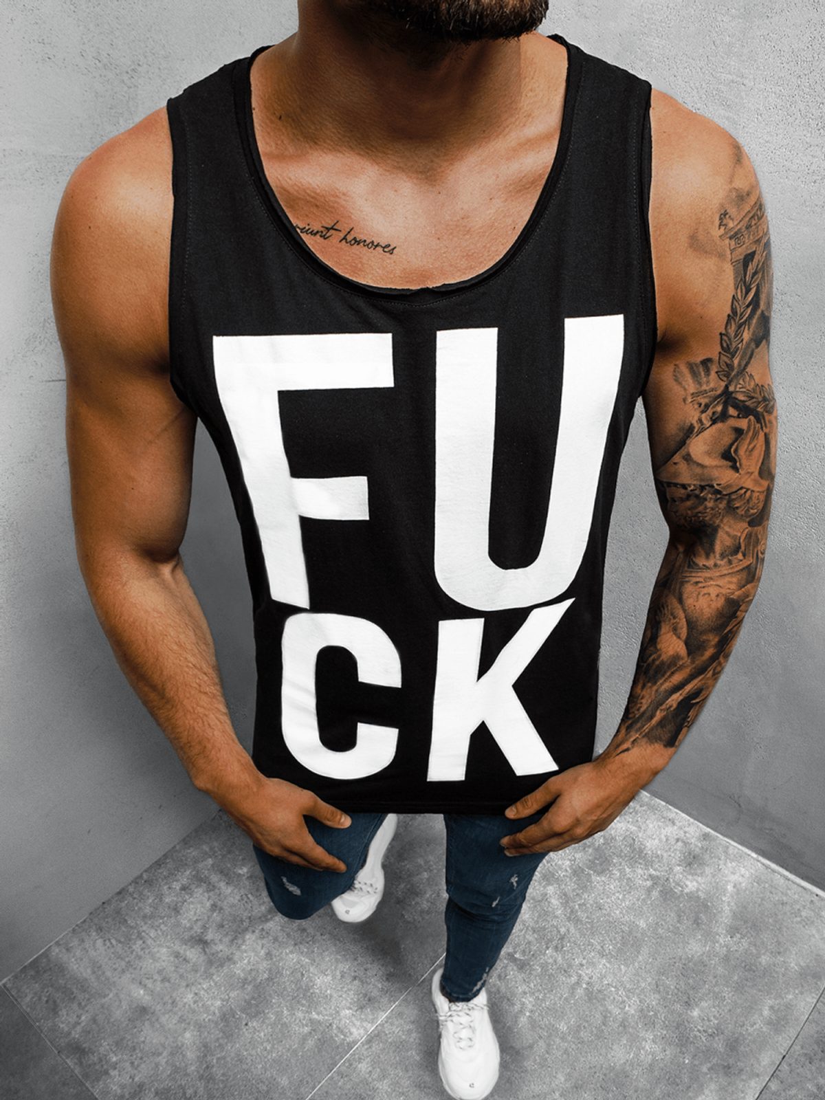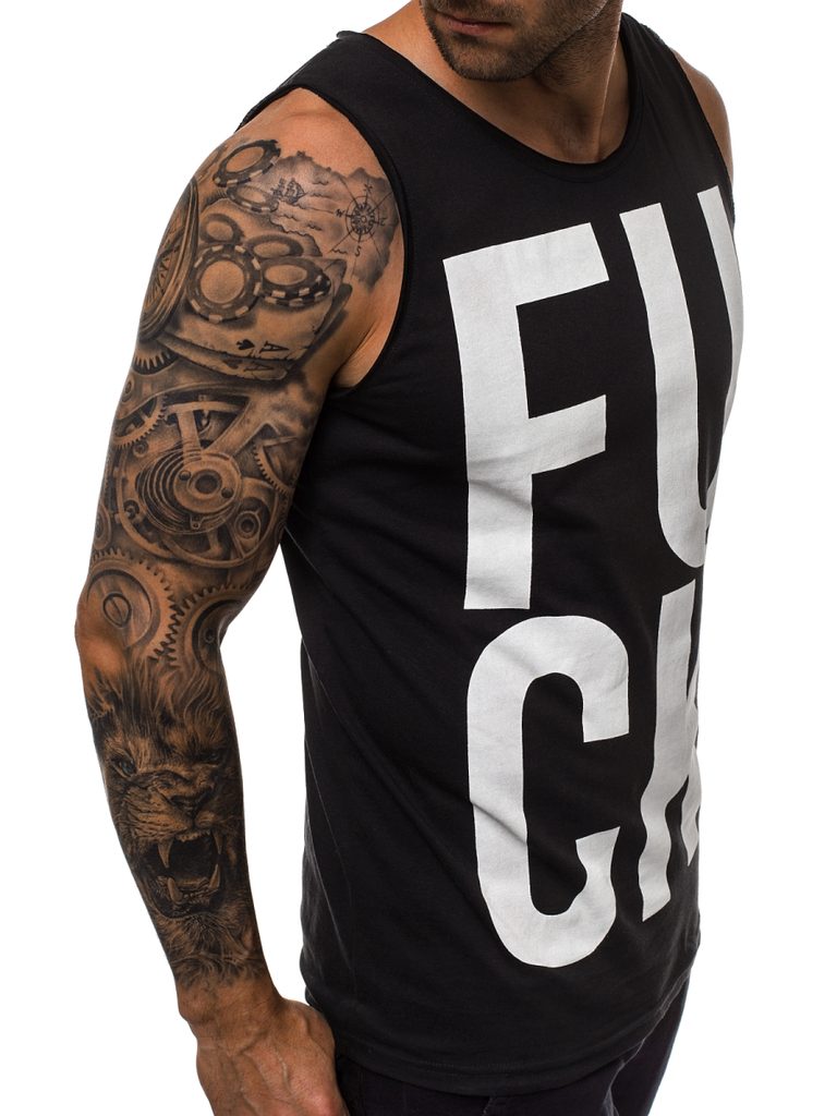 Elől nyomott felirattal, fekete ujjatlan póló. Kerek nyakkivágással. Kellemes viseletet biztosító, puha anyagból. Feneket takaró hossz.