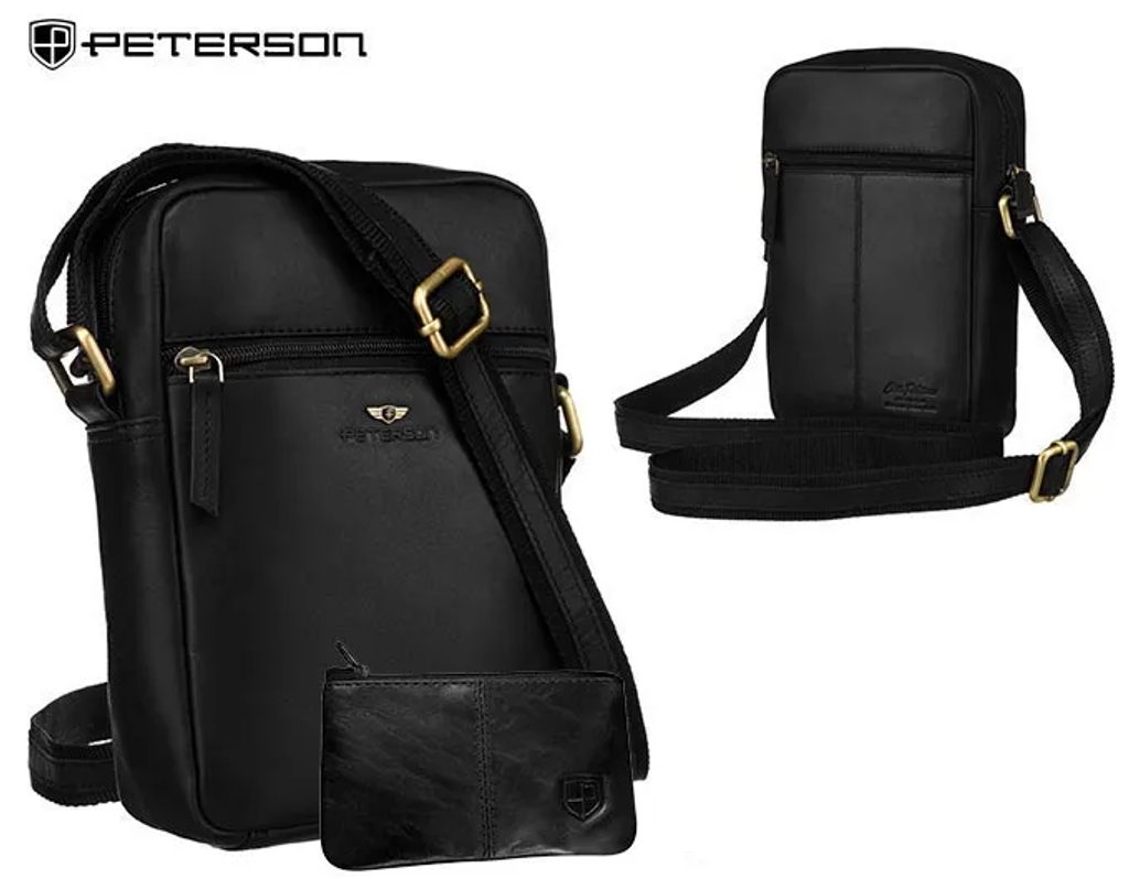 A modern fekete férfi válltáska kiváló minőségű bőrből készült. A táska praktikus zsebeket és rengeteg tárolóhelyet tartalmaz. A táska egy bőr tasakot is tartalmaz. A bőrtáska/minitárca aprópénz, kártyák vagy érmék tárolására szolgál, és illeszkedik a fő táska dizájnjához.