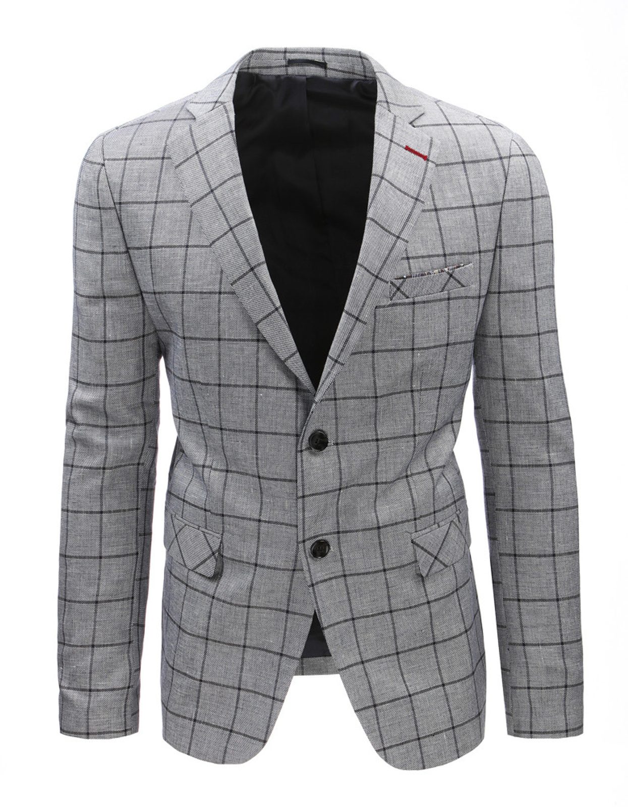 Halvány szürke elegáns zakó. Kockás mintás anyag. Két gombos fazon, elöl zsbfedős zsebekkel és szegett mellzsebbel. Könnyű anyagból, hátul hasítékkal. Kontrasztszínű bélés. Jól kombinálható.